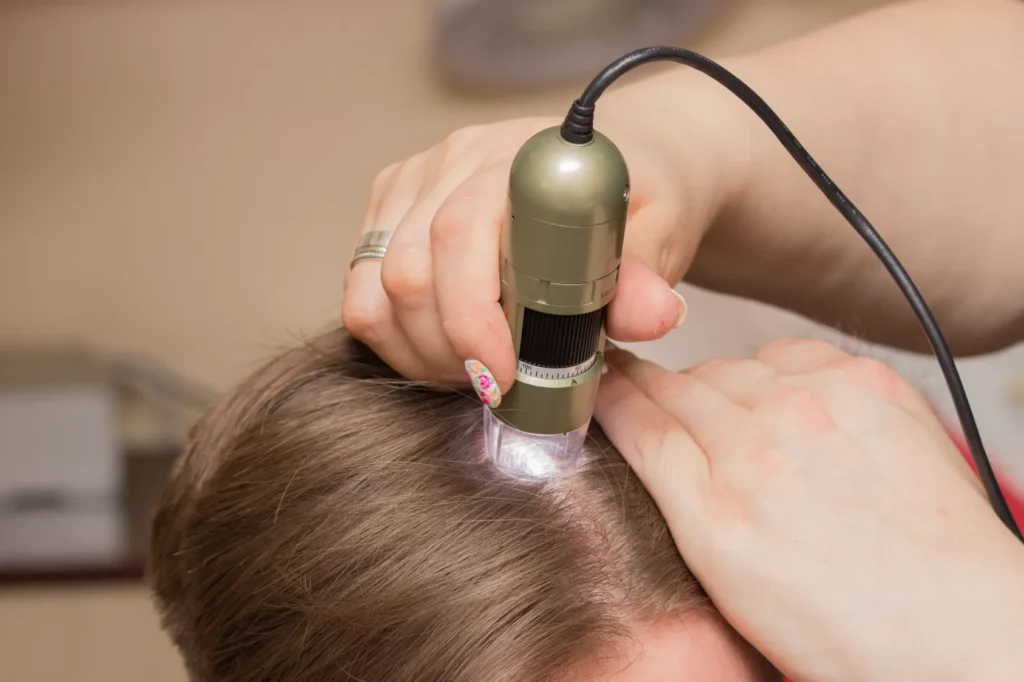 Badanie najczęściej zaczyna się od dokładnego wywiadu z pacjentem. W następnej kolejności trycholog używając mikro-kamery pozwalającej na kilkusetkrotne powiększenie, ogląda zmienione przez chorobę miejsce. Pacjent przebieg badania i stan włosów oraz skóry może obserwować na ekranie monitora. Badaniu poddawana jest nie tylko skóra głowy, ale również mieszki włosowe czy włosy, które wypadły.